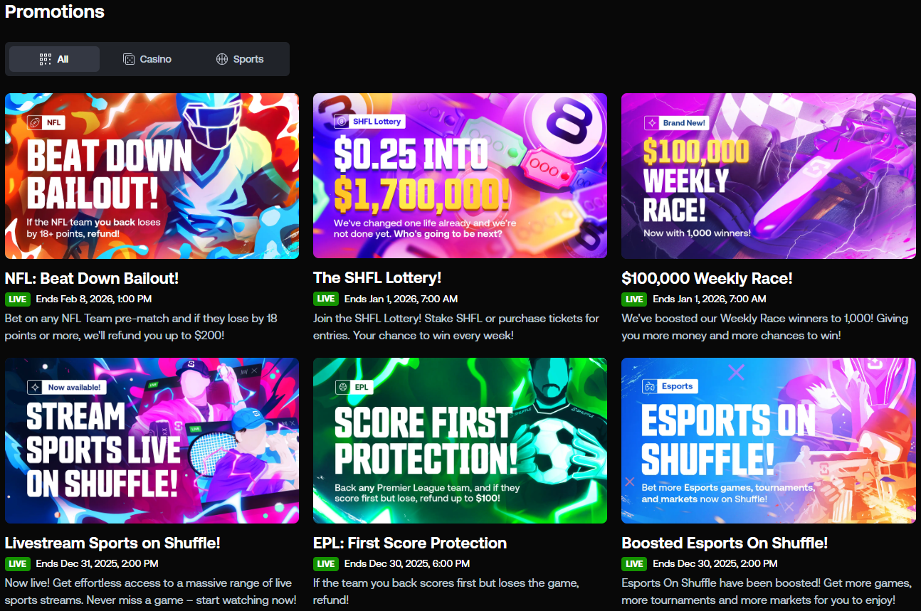 Shuffle provides live betting options, allowing you to place bets on ongoing events in real time.